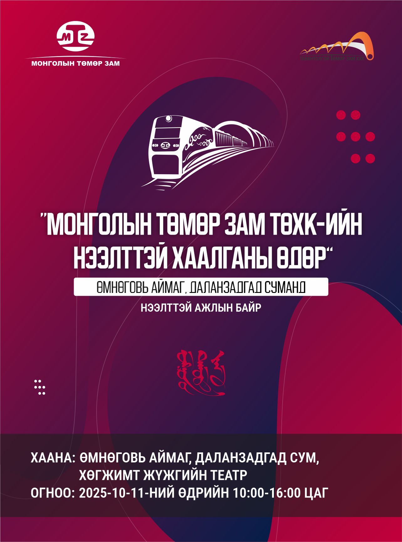 “Монголын төмөр зам” ТӨХК Өмнөговь аймгийн Даланзадгад суманд 2025 оны 10 дугаар сарын 11-ний өдөр “Нээлттэй хаалганы өдөр” арга хэмжээг зохион байгуулна. Уг нээлттэй хаалганы өдрөөр аймгийн иргэд, олон нийт, оюутан залууст төмөр замын нээлттэй ажлын байрнуудын талаар мэдээлэл хүргэж, төмөр замын үйл ажиллаагаа мэргэжлийн онцлогыг сурталчлан таниулах, Өмнөговь аймагт хийгдэж буй бүтээн байгуулалт, төслийн үйл ажиллагааны талаар дэлгэрэнгүй танилцуулга хийнэ.