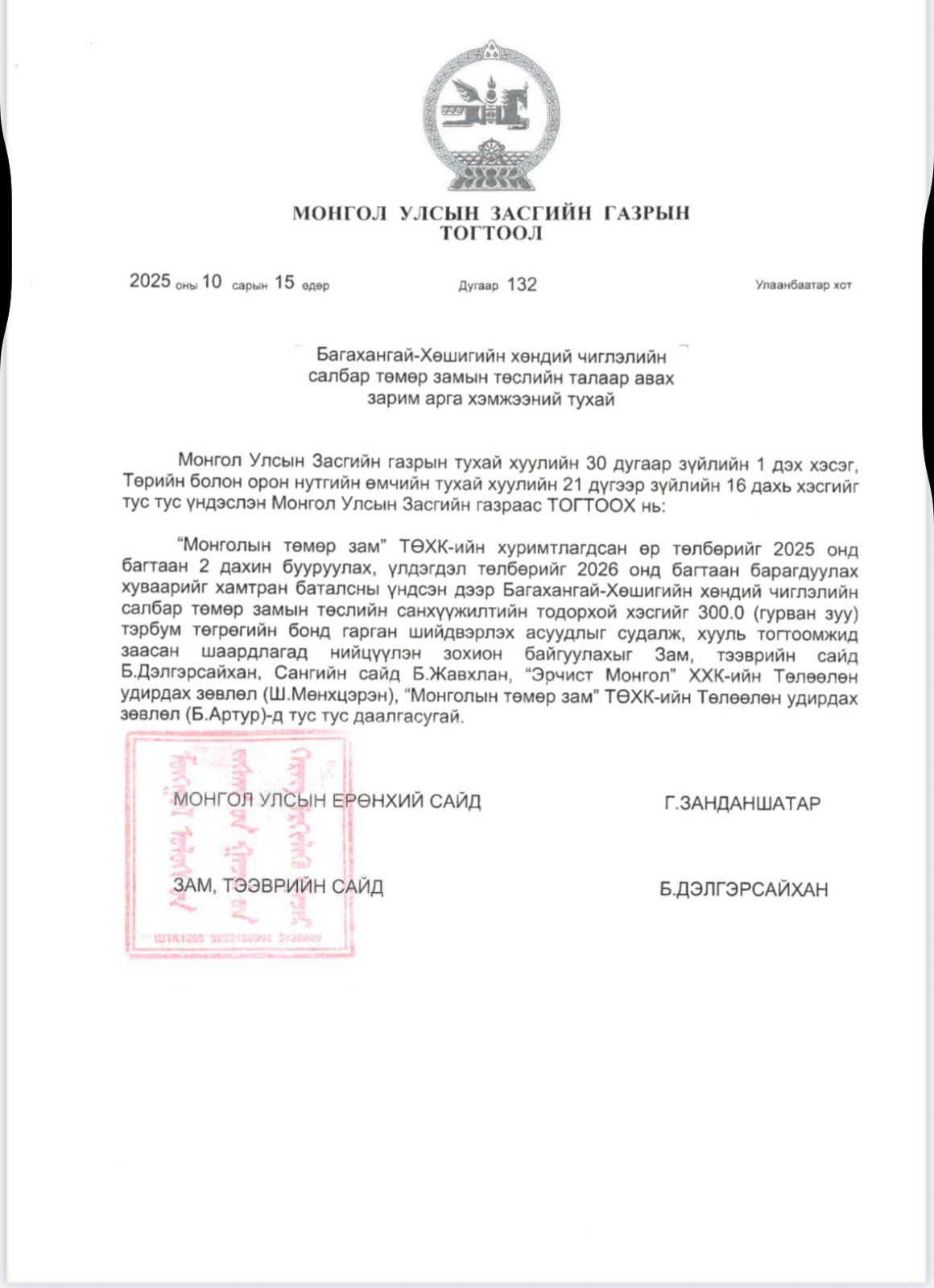 “Шинэ төмөр зам” ХХК байгуулж, дүрэм батлах тухай